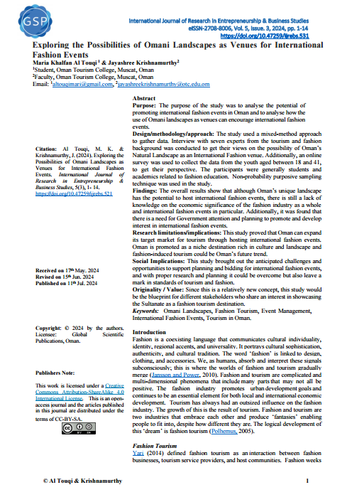 Originality Value: Since this is a relatively new concept, this study would be the blueprint for different stakeholders who share an interest in showcasing the Sultanate as a fashion tourism destination.